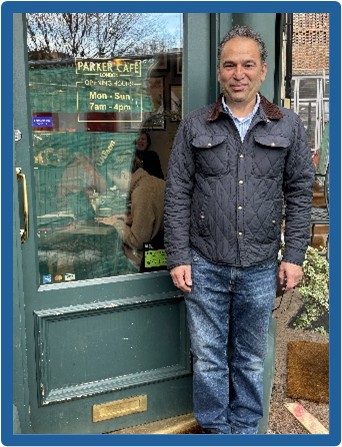 including the Thameswalk Apartments, in Parker’s Café on the corner of Parkgate Road and Radstock Street. There we had coffee and croissants, whilst we talked through with them, what to expect in the upcoming March hearing into the Glassmills appeal against the Council’s rejection of the proposed skyscraper development on Battersea Bridge. The friendly and popular proprietor, Parker, pictured here, kept us well plied with both coffees and croissants!