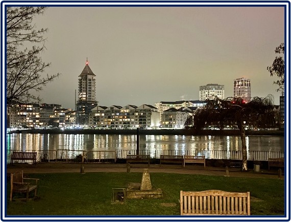 r the Labour Group but instead I went to hear Penny lecturing in St. Mary’s to the Battersea Society on “Homo Sapiens to Homo Zappiens: How variously human beings describe themselves” – a typically ambitious project. Like much of this January it was a cold, blustery evening and the attendance was not great and also to be blunt Penny was not at her best – the lecture needs some refinement. But two completely very different things were striking about the evening. First was just how exciting the night-time view of Chelsea Harbour and Imperial Wharf is from the church steps, especially at high tide – see picture. But secondly, we were looking for somewhere to eat in Battersea Square and Battersea High Street, and it was worrying to see just how desperately short of custom the restaurants were. They need our support! At least that is how it looked in one unscientific survey on one cold Thursday evening in mid-January.