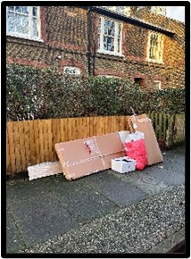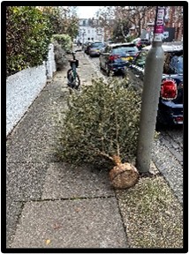 sightings, which I report to the Town Hall, and which hopefully get cleared soon afterwards. Abandoned bikes, Xmas trees & bad bike parking, building materials, a door and a mattress – just why are some of our neighbours so anti-social? No tree roots and bad pavements this time, but often there are. It would help the Council an enormous amount if everyone of my readers photographed obstructions like these and reported them on the Council’s website, which is always being updated to make reporting like this much easier – search for fly tipping. But it would not only be helping the Council; it would also make life better for us all to see the rubbish cleared quickly and cleanly.