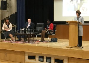 opposite the Dogs’ Home, for a very different kind of hustings. Chaired by the Headteacher and attended by pupils and parents, with pre-written questions carefully presented by pupils, this was a much more ordered occasion. The panel was the Lib/Dem’s Richard Davis and Marsha but also the Conservative candidate, Jane Ellison, seen here at the lectern. Jane, our MP since 2010, knew her stuff, OK, but she does not put over her message with the same passion and belief as does Marsha. I know I am biased but I think Marsha won the hustings competition.