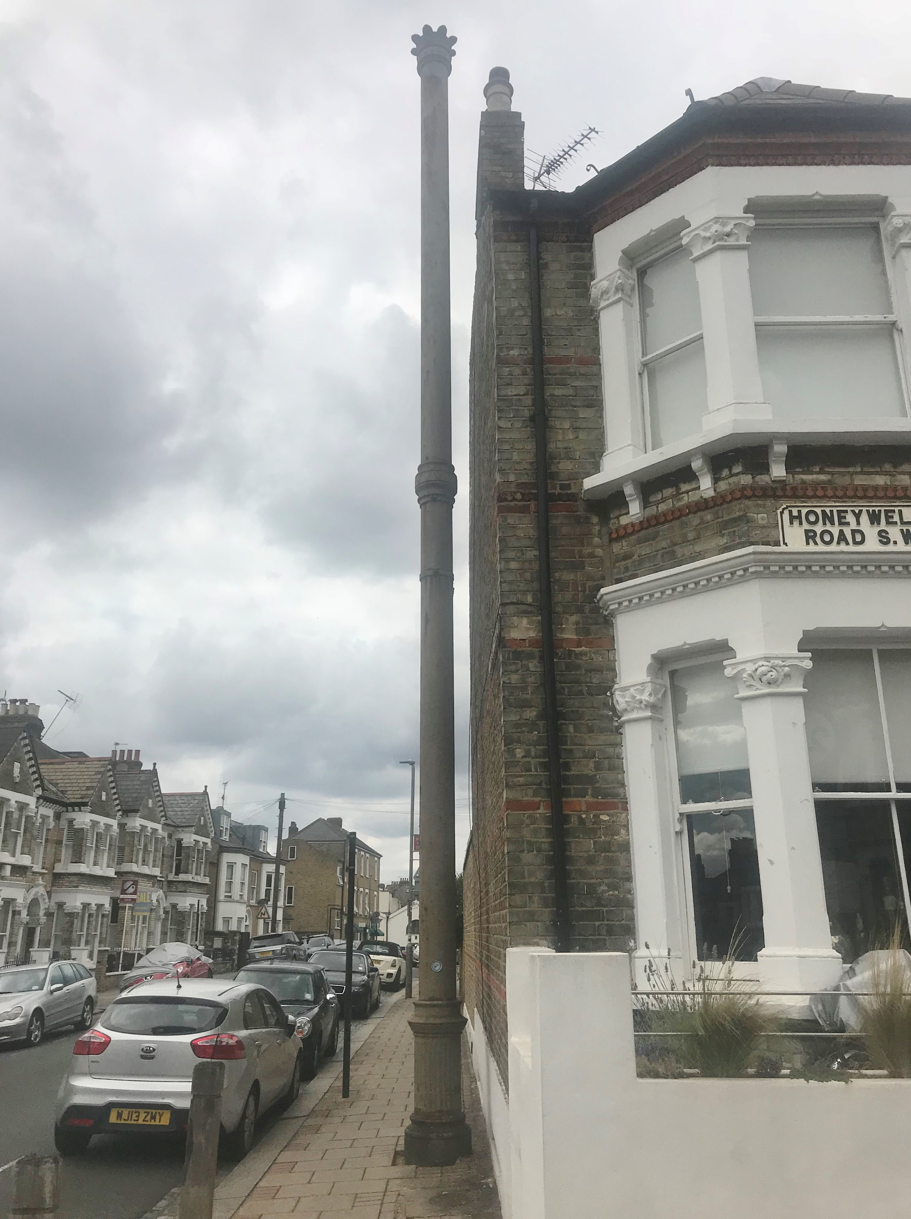 The answer is that it is a “stink pipe” or as one person said a “stench pole”, installed by the Victorians to take the stench out of the sewerage system and expel it high into the sky. There are hundreds of them on our streets and most of us never notice them. There are about four on Bolingbroke Grove alone. One respondent sent me the addresses of three websites devoted to mapping and photographing them and yet another tells me that they were exported to Sydney, Australia, where they can also still be found. Here is just one of the websites: http://stinkpipes.blogspot.com/