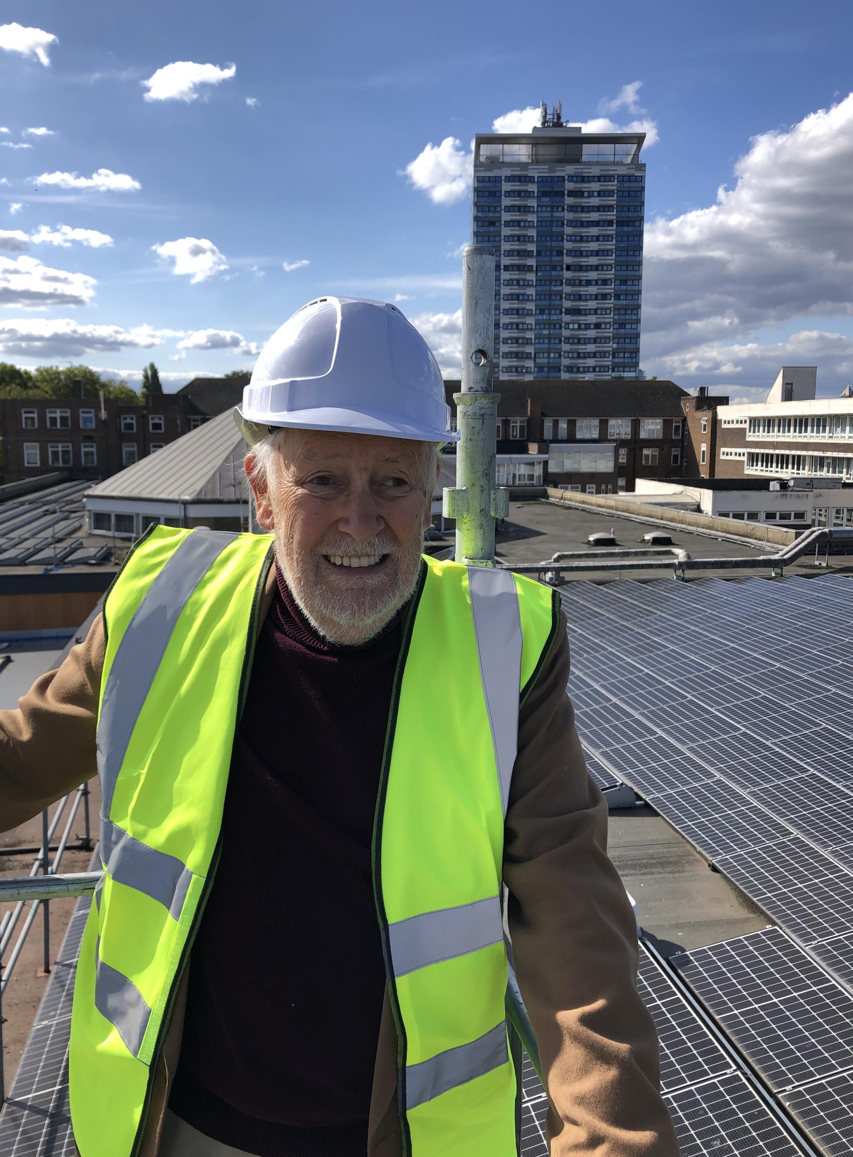 of the derelict site at the corner of Culvert and Battersea Park Roads – and in Dagnall Street. At the time, I said that at last, the kids at Harris Academy will have a decent gym/sports hall. Well, on 24th September I visited the site and here I am on the roof of the gym building, which will include changing facilities, and two new class – note, the field of photovoltaic cells on adjoining parts of the school. The aim is to complete this building by May 2026, and to have the main site re-developed by spring, 2028.
