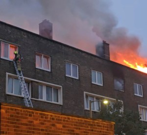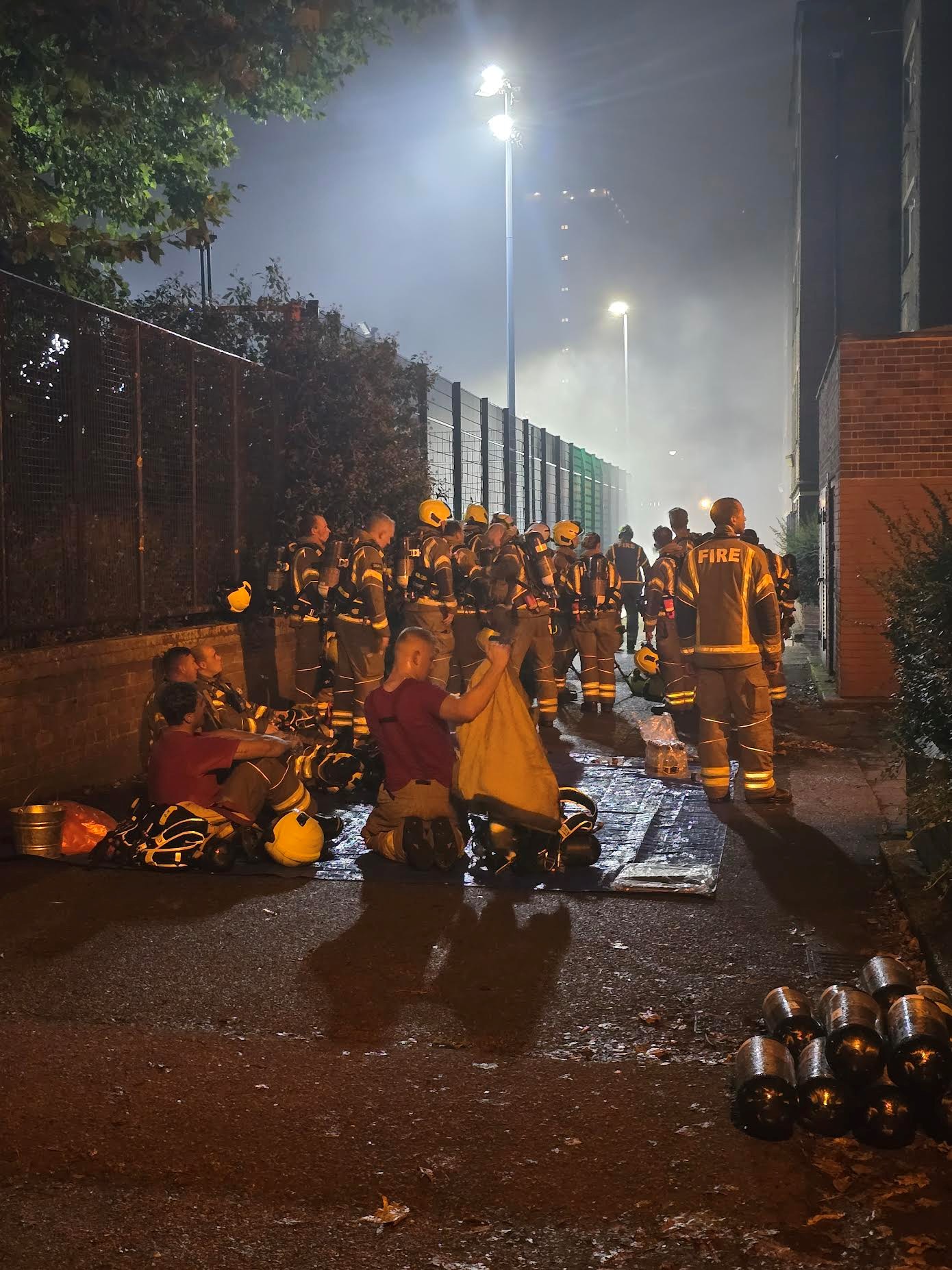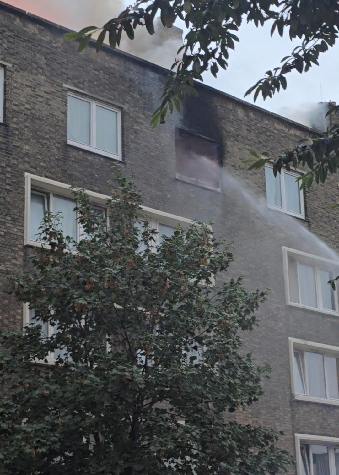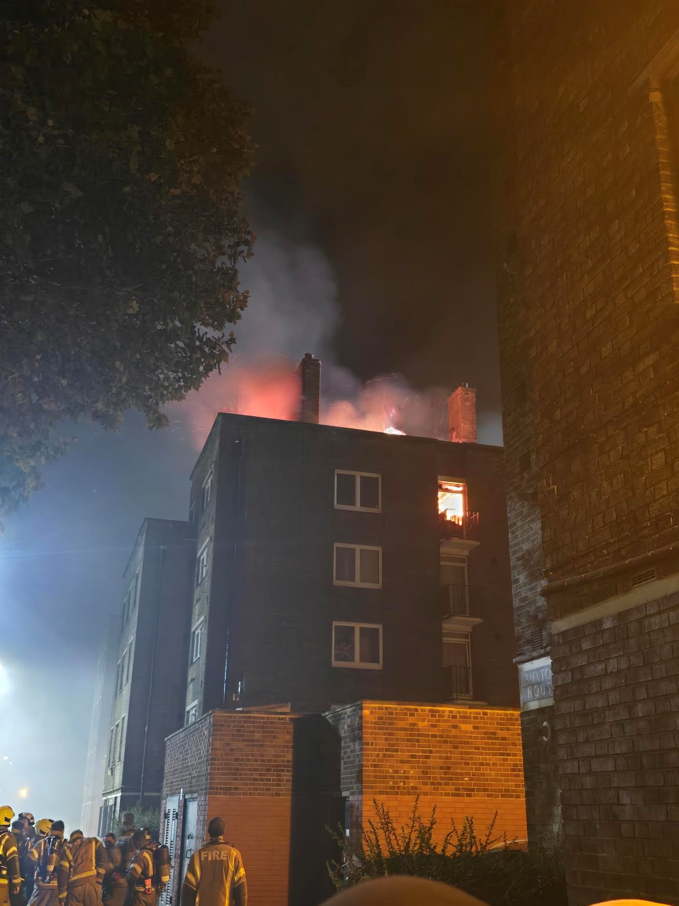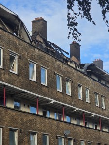 This is what we saw when we stepped out of Buxton House at around 7.30 to see what was going on. At the time, only the one flat was on fire, in the middle of the top floor.