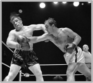 heartlands of the London boxing scene? There used to be regular boxing events put on in Battersea Town Hall (now the BAC). Probably the biggest star was Don Cockell, aka the Battersea Bruiser, who in 1955 went 9 rounds with the fiercesome, American heavyweight champion, Rocky Marciano. Cockell was British, European and Commonwealth champion. Here Cockell, in black shorts, takes a right-hook from Marciano – in Madison Square Gardens, NY.