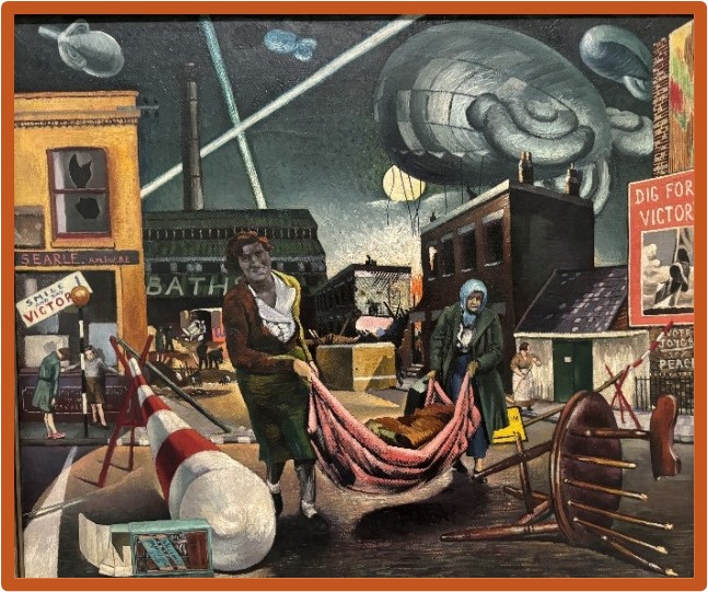 was a British artist, who fought in the Spanish Civil War and sadly died in WW2 in Burma, now Myanmar, in 1944. He was a true socialist, who lived for many years in Battersea. His most famous painting, Selling The Daily Worker outside the PECO factory, I have shown before but on display with it at the Tate was this social-realist painting Bombed Women and Searchlights. The building under the searchlights are public baths – probably the long since demolished Nine Elms Baths? Note, in this moving and historic picture, the giant barrage ballon overhead, the broken windows and the Dig for Victory poster.