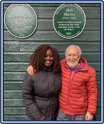 the unveiling of a plaque to Bob Marley, who lived across the river in Chelsea, but regularly played football in the Park. Self-confessedly, the soccer he played displayed none of the gentleness and love to all men that he sang about. The unveiling was a passionate and cheerful occasion attended by some of his soccer team-mates, our MP, Marsha de Cordova, my fellow councillor Maurice McLeod and launched by the High Commissioner for Jamaica. In this photo Marsha and I are pictured in front of the two plaques – one to Marley and the other to the first football match ever played in the world under FA rules.