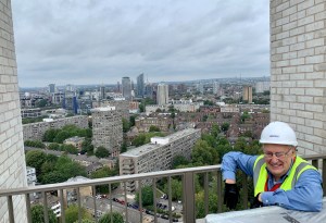 council tenants of the Winstanley Estate. Duval House is the tall one, on the corner of Winstanley and Grant Roads, and will be sold for private occupation. Duval House is the “cash cow”, which enables the Council to proceed with the regeneration. The third building will house the combined Thames Christian College and Battersea Baptist Church, both now located in Pennethorne Square. We were both very impressed by the quality of the buildings and the high ecological standards to which they are being built. Here is Simon’s picture of me, taken from the “viewing” platform at the top of Duval House. - That afternoon, I went to a webinar (a seminar conducted on the web), where the principal, but not sole, contributor was economist, author and one-time editor of The Observer, Will Hutton. He was not very optimistic about the future. He also argued that fundamental constitutional reform, protecting the rights of Scotland, Wales and Northern Ireland, will be an essential pre-condition to the continued existence of the UK. However, I did not find the discussion overall very engaging. The format is remote and my main concern is to feel sympathy for this year’s university students: for whom learning online will be both the norm and very difficult.