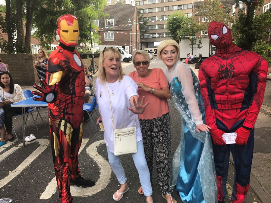 work, maintaining community spirit in the Kambala Estate, organising summer day trips to the coast and winter trips to the Christmas market in Oxford. Donna was thinking of standing to be a councillor at next May’s Council election. It would have been great to have had her on Wandsworth Council as a colleague, but she decided her community work was, and is, more important to her. Here is Donna, second left, along, with two Spidermen, Princess Elsa, from Walt Disney’s Frozen, and a Kambala resident.