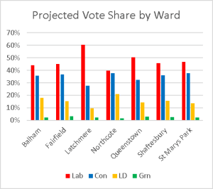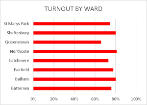 high overall at 76% compared to 71% in 2017. It seems that the projected turnout was highest in Balham, Northcote and Shaftesbury at just over 80%. However, in Queenstown only just over 65% made the effort. There are, of course, other factors. Queenstown almost certainly has a more transitory electorate than Northcote and because of that instability Queenstown’s register is probably less accurate – in other words the 15% differential in turnout is half technical, because the register is less accurate, and half demographic, because the population is less locally committed, younger and less established than Northcote’s.