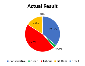 Labour’s share was 46% of the overall vote and the Conservative share 36%. Labour’s vote share was also 46% in 2017 but the Tory vote was 42%. So, this indicates that Labour held on to its vote share, but the Tories lost votes to both the Lib Dem and Green.