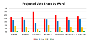 high overall at 76% compared to 71% in 2017. It seems that the projected turnout was highest in Balham, Northcote and Shaftesbury at just over 80%. However, in Queenstown only just over 65% made the effort. There are, of course, other factors. Queenstown almost certainly has a more transitory electorate than Northcote and because of that instability Queenstown’s register is probably less accurate – in other words the 15% differential in turnout is half technical, because the register is less accurate, and half demographic, because the population is less locally committed, younger and less established than Northcote’s.