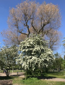 another. Brilliant weather, day after day. The sunniest May on record and probably the warmest and driest. Again, I have sat in the garden for more hours in May, than in some years in the past, and there enjoyed the bird song”. The bluebells and the apple blossom have now gone and, judging from the Park and the Common, we are on the verge of an official drought. Last month I had a picture of May blossom, this time my tree of the month is this magnificent young oak on Wandsworth Common.
