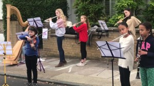 “clapathon” in honour of the emergency workers. It was followed by a concert, given by 11 local schoolgirls. The picture shows 6, with the harpist hidden by the violinist, the 8th and 9th playing cellos off to the left and two flautists off to the right. All were accompanied by the pianist, the musical mother of the violinist, who arranged the ensemble. They were spectacularly good with the violinist simply outstanding.