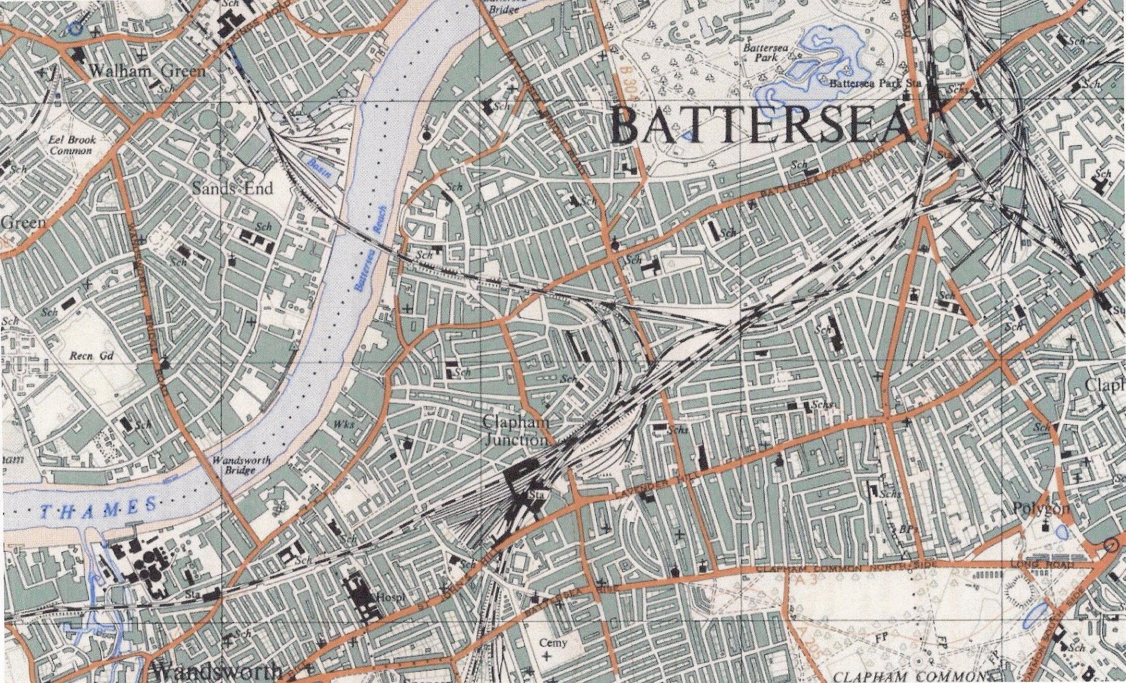 Ordnance Survey map, dated 1961. It’s worth a close look to see something of what Battersea was like then. The most obvious difference between then and now is that Wandsworth Bridge simply ends at a T-Junction with York Road, rather like Albert Bridge Road. But other obvious differences include housing where there is now Banana or Falcon Park, and a traditional road layout, with Victorian terrace houses in the whole Plough/Falcon/York Roads and railway line quarter. Neither the Battersea Fields estate or the Doddington are in this map – again all are Victorian or Edwardian terraces. What do you notice as being different in your area?