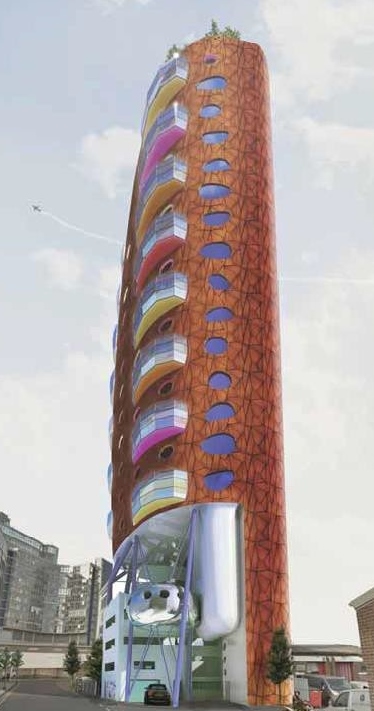 construction of The Alchemist – the pub on St. John’s Hill, opposite the Health Centre, “illegally” demolished five years ago. And, as usual, there were applications for yet further large developments in Nine Elms. There was also an application for a very modern, “alternative” design 15 storey block next to the Heliport and pictured here. It looks interesting or mad, depending upon your tastes, but one thing is for sure: I certainly don’t vote against all new development, but I think this one is totally inappropriate: the skyline and nature of Battersea is changing fast, and is under pressure to change future.